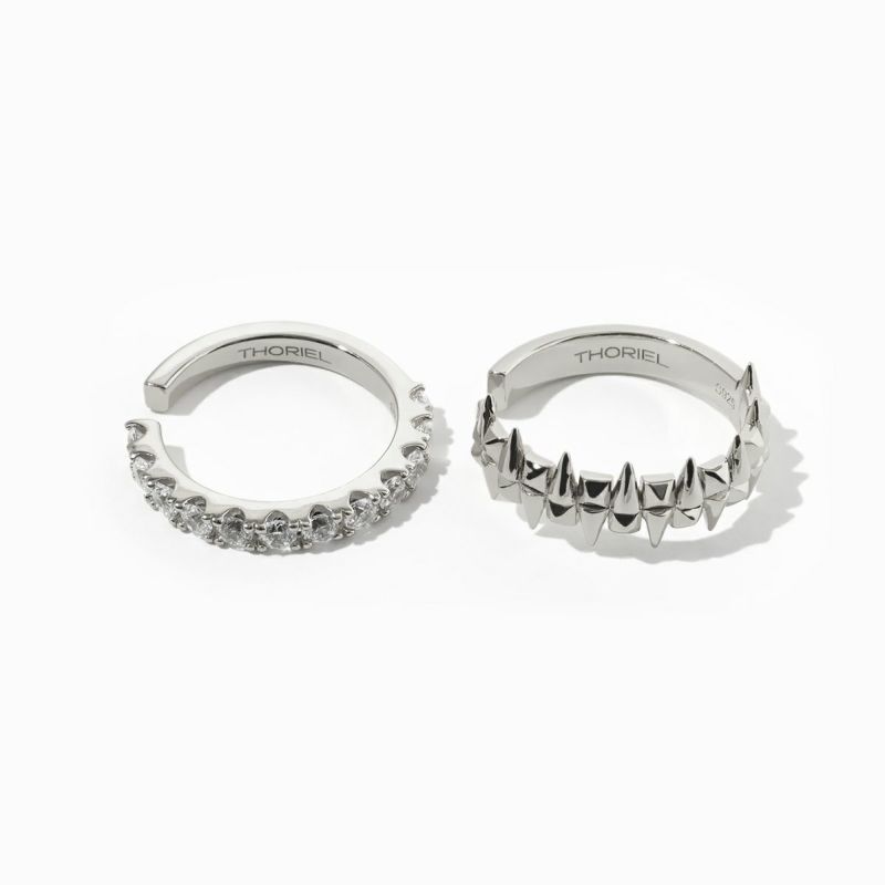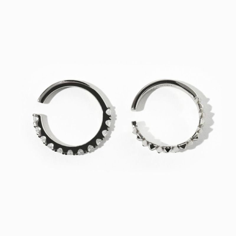 棘をイメージしたパーツとスタッズをミックスしたデザイン性あふれるイヤーカフと、シンプルなフォルムで輝くストーンイヤーカフの2個セット。